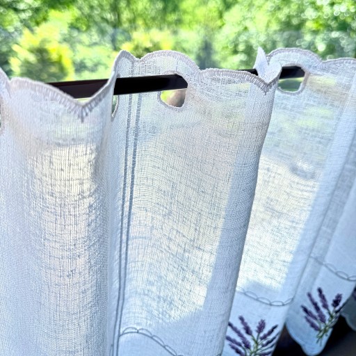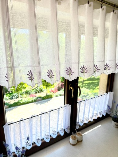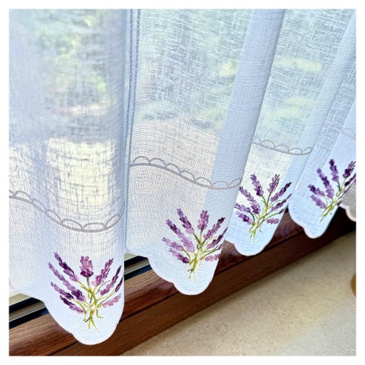Przedmiotem sprzedaży jest biała firanka typu zazdrostka . Tkanina do złudzenia przypomina naturalny len ozdobiona haftem bukiecików lawendy w odcieniach fioletu a gałązki w kolorze zieleni , takie zestawienie obłędnie wygląda w oknie. .