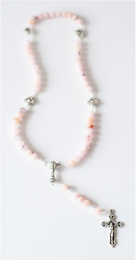 Różaniec komunijny z kamieni opal różowy na sznurku o długości około 32 cm, średnicą koralika 6 mm, obwód wewnętrzny około 40 cm.