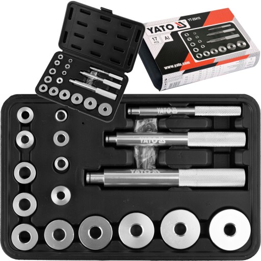 17- elementowy zestaw marki YATO, służący do montażu poprzez pobijanie łożysk oraz uszczelniaczy.
