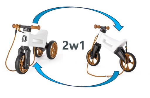 - 2 w1-możesz łatwo zmienić trójkołowy rowerek biegowy na dwa koła. Dziecko nie musi przyzwyczajać się do nowego rowerku, nadal jeździ swoim "starym, znajomym" rowerkiem biegowym. Bez stresu i bez strachu nauka nowego rodzaju ruchu i równowagi