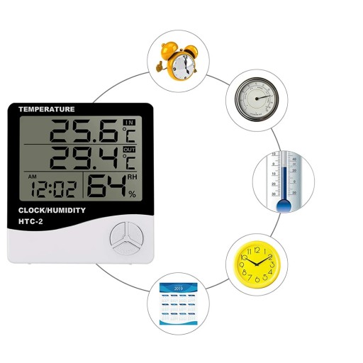 Wysokiej jakości niewielkich wymiarów stacja pogody z czytelnym wyświetlaczem LCD. Na panelu możemy odczytać aktualną temperaturę oraz wilgotność w pomieszczeniu, a także datę i czas. Ponadto, urządzenie umożliwia ustawienie alarmu, zapamiętuje maksymalne i minimalne pomiary temperatur oraz wilgotności powietrza. Dzięki wbudowanym przyciskom możemy zmienić tryb wyświetlania godziny 12/24H oraz ustawić skalę pomiarów temperatury na Celsjusza lub Fahrenheita. W zestawie znajduje się kompatybilna bateria więc nie ma potrzeby kupowania jej na oddzielnych aukcjach.