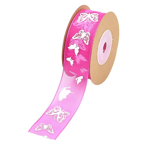10 metrów szyfonowa wstążka z nadrukiem motyla 25 mm różowo-czerwona