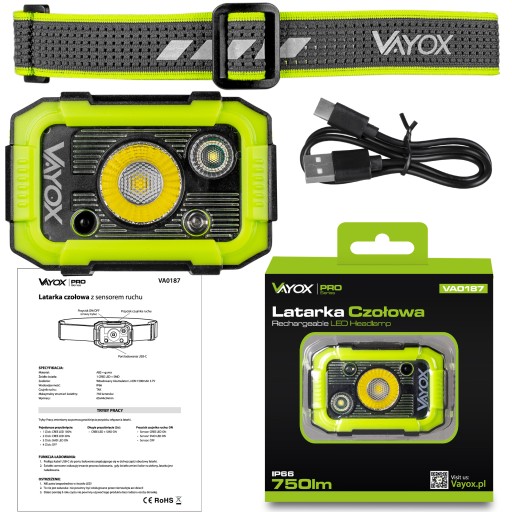 W zestawie: Latarka VA0187, Wbudowany akumulator 3,7V 1500mAh, Opaska na głowę, Kabel USB-C, Instrukcja obsługi, Oryginalne opakowanie
