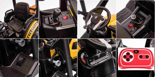 Napęd zapewniają mu dwa potężne silniki elektryczne 24V każdy po 200W, zasilane akumulatorem 24V7Ah. Na wyposażeniu pojazdu znajdują się uruchamiane przyciskami efekty dźwiękowe, port USB - możliwość słuchania muzyki z pendrive, regulator głośności, światła LED. Dostępne są 3 prędkości poruszania z pilota. Bezpieczną naukę jazdy zapewnia dołączony pilot zdalnego sterowania 2.4G, dający rodzicowi pełną kontrolę nad pojazdem. Przyczepkę można odpinać, dach ewentualnie można zdemontować, ruchoma łyżka z możliwością demontażu.