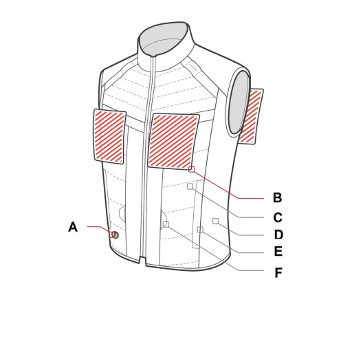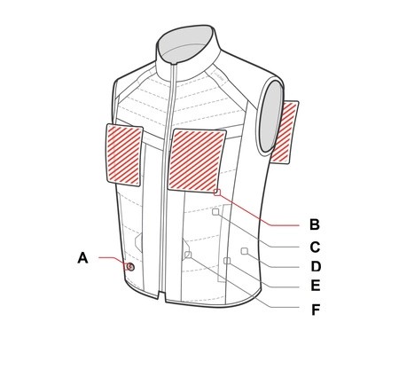 - kamizelka podgrzewana jest za pomocą specjalnych paneli umiejscowionych w kluczowych miejscach aby zapewnić optymalną temperaturę dla ciała,