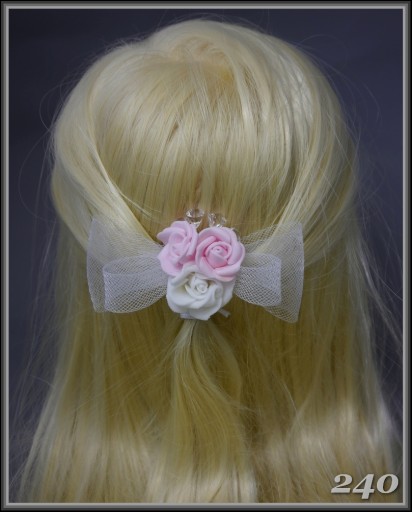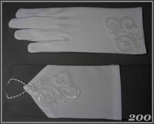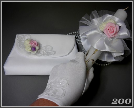 Komplet komunijny: torebka prostokątna satynowa ozdobiona koronkową aplikacją z kolorową przypinką, rękawiczki, okapnik na świecę satynowo-tiulowy.