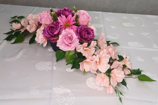 Wiązanka nagrobna wykonana ręcznie z wysokiej jakości sztucznych kwiatów w donicy zalanej betonem.