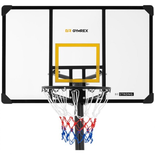 Tablica do koszykówki marki Gymrex doskonale sprawdzi się na boiskach przy szkołach, ośrodkach wypoczynkowych lub na osiedlowych podwórkach. Regulowany stojak w zakresie od 230 do 305 cm. Obręcz kosza ma średnicę 45 cm. Materiały wykonania (stal, akryl, HDPE, nylon) umożliwiają wykorzystywanie kosza na zewnątrz. Odporna na blaknięcie grafika na tablicy oraz siatka doskonale znoszą deszcz, upał czy niską temperaturę. Podstawa po wypełnieniu piaskiem lub wodą gwarantuje zachowanie stabilności. Duże kółka (100 mm) zapewniają mobilność.