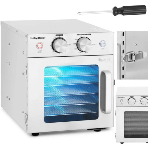 Suszarka do żywności marki Royal Catering umożliwia wysuszenie grzybów, warzyw, owoców a także mięsa czy ziół. Duża moc urządzenia 500 W gwarantuje szybką i skuteczną pracę. Temperatura regulowana jest w zakresie 30-90°C. Timer umożliwia utrzymywanie jej w zakresie 0-15 h. Wnętrze urządzenia wyposażone zostało w 6 tac ze stali nierdzewnej. Obudowę wykonano ze stali nierdzewnej. Drzwiczki posiadają okno z hartowanego szkła. Gumowe nóżki zapewniają urządzeniu stabilność.