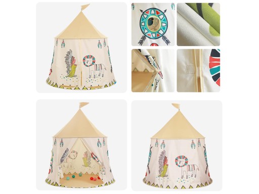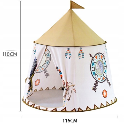 ✔️ Materiał: Namiot wykonany jest z łatwo czyszczącego, przewiewnego materiału z grafiką odpowiadającą indiańskim tipi.