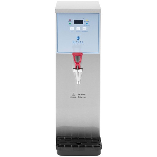 Dystrybutor gorącej wody marki Royal Catering ma pojemność 10 l. Zewnętrzne przyłącze zapewnia ciągłe uzupełnianie wody a co za tym idzie nieograniczony dostęp do kawy, herbaty i innych napojów, zapewniając do 30 litrów wody na godzinę. Temperatura regulowana jest w zakresie 0-100°C, za pomocą cyfrowego panelu. Warnik posiada duży ekran LED, który pokazuje poziom grzania. Inne ikony informują o uzupełnianiu wody lub podgrzewaniu do ustawionej temperatury. Automatyczny timer pozwala włączać i wyłączać warnik. Wbudowany kran precyzyjnie nalewa wodę do filiżanek. Taca ociekowa zapewnia czyste miejsce pracy. Dozownik wykonano ze stali nierdzewnej, która jest higieniczna i łatwa w czyszczeniu.
