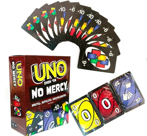 UNO No Mercy Bez litości to najbardziej bezwzględna wersja UNO™! Ma o wiele więcej kart i DUŻO surowsze kary (dobieranie 10 kart to wyzwanie!), a do tego nowe reguły, przez które gracze będą dokładać, wymieniać i dobierać więcej kart niż kiedykolwiek wcześniej.