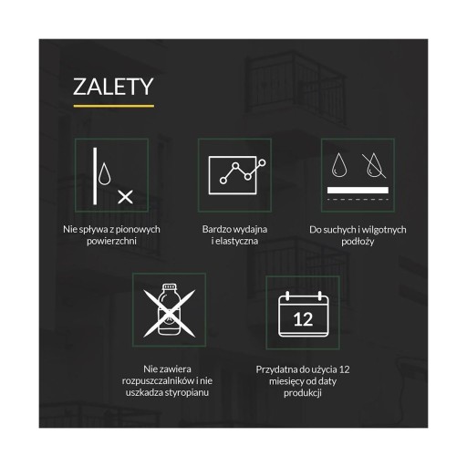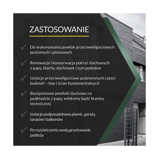 - Zalety produktu Zalety: - do suchych i wilgotnych podłoży;- nie spływa z pionowych powierzchni;- nie zawiera rozpuszczalników i nie uszkadza styropianu;- bardzo wydajna i elastyczna;- przydatna do użycia 12 miesięcy od daty produkcji. Zastosowanie: - do wykonywania powłok przeciwwilgociowych poziomych i pionowych;- renowacja i konserwacja pokryć dachowych z papy, blachy, dachówek i tym podobne;- izolacje przeciwwilgociowe podziemnych części budowli – ław i ścian fundamentalnych;- bezspoinowe powłoki dachowe na podkładzie z papy, włókniny bądź tkaniny technicznej;- izolacje podposadzkowe piwnic, garaży, tarasów i balkonów;- po rozcieńczeniu wodą gruntowanie podłoży