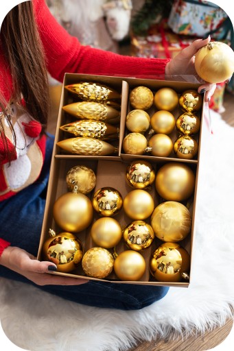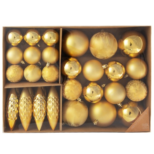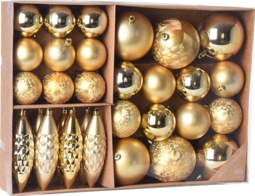 Wykonane są z wysokie jakości tworzywa sztucznego do złudzenia przypominającego tradycyjne bombki choinkowe ze szkła. W zestawie znajdziemy 31 sztuk bombek w tym w średnicach 4, 6 i 8 cm, a także bombki-sople o długości 12 cm. Wszystko w kolorze złota. Bombki mają średnicę występują w wersjach matowych, błyszczących i z efektem szronu. W komplecie są eleganckie sznureczki do zawieszenia na choince.