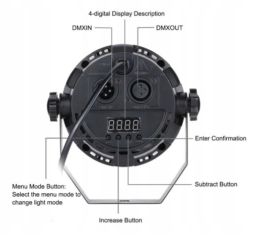 4 Tryby sterowania: Obsługa 4 trybów sterowania: DMX512, master-slave, aktywowany dźwiękiem i automatyczny przez przesuwanie przycisku z tyłu tego światła, cyfrowy wyświetlacz dla łatwiejszej obsługi, bardzo wrażliwy na rytm muzyczny, elastyczny w użyciu.