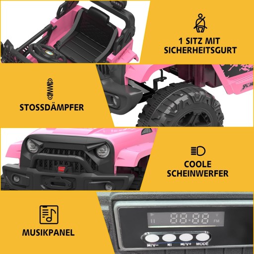 🚙MOC 12 V I REALISTYCZNA KONSTRUKCJA: Regulowany pas bezpieczeństwa, jasne reflektory LED, zamykane drzwi i siateczkowa szyba przednia zapewniająca styl terenowy, z silnikiem 12 V i oponami trakcyjnymi do jazdy w różnym terenie.