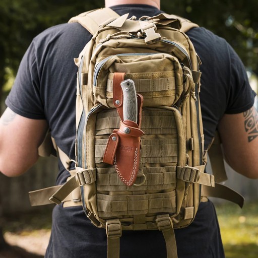 W zestawie z nożem otrzymujemy kaburę wykonaną z brązowej skóry. Posiada ona zapięcie wokół rękojeści noża z logo producenta zabezpieczające przed przypadkowym wysunięciem a także zestaw pasków (szlufek) do przenoszenia noża w każdej właściwie pozycji (pionowa, pozioma, odwrócona). Jest ona również kompatybilna z systemami MOLLE. Pochwa została gustownie ozdobiona jasnymi, mocnymi szwami oraz tłoczonym logo producenta.