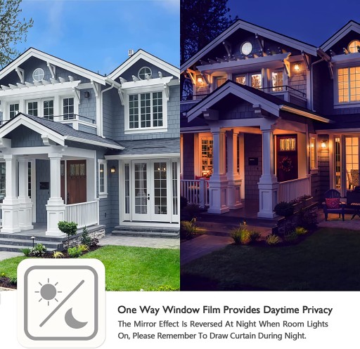 【Ochrona prywatności w ciągu dnia】 Jednokierunkowa folia chroniąca okno chroni prywatność w ciągu dnia. Efekt lustra jest odwrócony w nocy, gdy światło wewnętrzne jest silniejsze niż na zewnątrz, na przykład w pokoju są włączone światła, ponieważ wnętrze będzie wystawione na więcej światła niż na zewnątrz, więc wnętrze będzie widoczne na zewnątrz.
