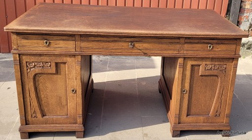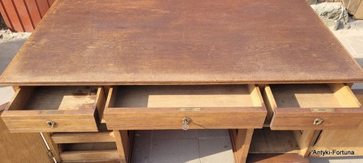 Stare biurko w stanie jak na zdjęciach .Biurko składa się z 3 elementów [ 2 szafek + blat z szufladami] .Jest to pomocne przy przewożeniu ,przenoszeniu czy też przestawianiu. Wymiary : 145x79 cm , wys 76 cm. cm . Przestrzeń na nogi szer 60 cm , wys 60 cm , 1 klucz do 3 szuflad , brak do szafek , szafka prawa brak zamka . Drewno dąb .Możliwa wysyłka .