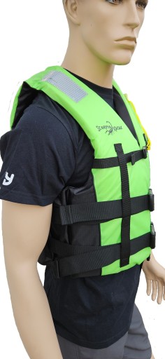 W celu odpowiedniego dopasowania kamizelka została wyposażona w trzy pasy zakończone solidnymi klamrami oraz pas krokowy ,który możemy schować w specjalną kieszeń w momencie jeżeli go nie używamy. Ze względów bezpieczeństwa każda kamizelka posiada gwizdek umieszczony w kieszonce na lewej piersi oraz dwa elementy odblaskowe na ramionach. Poszycie kamizelki wykonane jest z wodoodpornej tkaniny Oxford a jej wnętrze wypełnione zostało pianką EPE. Wewnątrz, na dole pleców kamizelka została wyposażona w otwory pozwalający na odpływ wody z kamizelki po jej całkowitym zamoczeniu.
