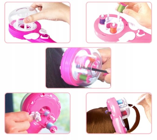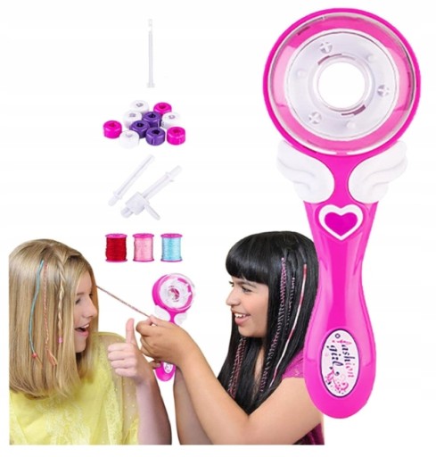 Innowacyjne urządzenie stworzone specjalnie dla miłośniczek niebanalnych fryzur. Dzięki Hair Machine w mgnieniu oka przyozdobisz kolorową paletą tęczy swoje włosy i wyróżnisz się na tle rówieśniczek. Urządzenie jest bardzo lekkie i ciche, a cała operacja stworzenia niebanalnej fryzury wymaga zaledwie przyciśnięcia jednego guzika, bez konieczności wykonywania skomplikowanych ruchów czy spędzania czasu na ręcznym zaplataniu.