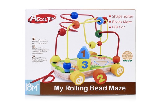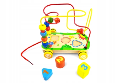 FUNKCJE: LABIRYNT Z KORALIKAMI, SORTER Z 3 KLOCKAMI, SZNURECZEK DO CIĄGNIĘCIA, WYM. OPK: 21,8 X 22 X 2,8 CM., 18M+