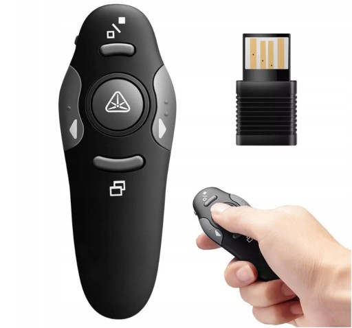 Bezprzewodowy prezenter laserowy wyposażony jest w specjalny nadajnik, który podłączamy do komputera za pomocą portu USB. Dzięki temu narzędziu możemy kontrolować przebieg prezentacji, zmieniać slajdy, włączać filmy czy pokazywać zdjęcia.