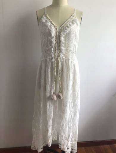 Rozkloszowana sukienka z kwiecistej koronki z dekoltem w kształcie litery V, frędzlami, regulowanymi ramiączkami typu spaghetti, marszczonymi panelami z tyłu, wycięciem w talii i nowoczesnym, wydłużonym obszyciem.