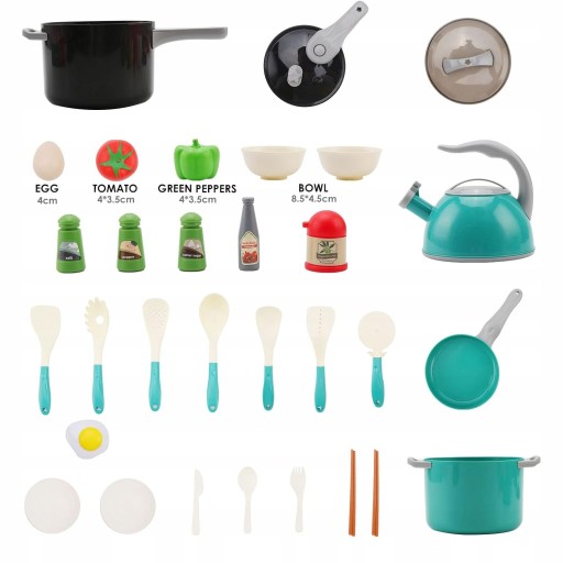 Śliczny zestaw garnków, który idealnie sprawdzi się w kuchni małego kucharza rozwijając jego zdolności manualne pozwoli przygotować mu wiele różnych dań. Wyposażony jest w komplet garnków ze zdejmowanymi pokrywkami oraz patelnię, na którą także pasuje pokrywka z garnka. Czajnik ma również zdejmowaną pokrywkę i ruchomy gwizdek, dzięki czemu można go faktycznie napełnić wodą. Gotowanie ułatwią dołączone przybory kuchenne, jak np. łyżka do makaronu czy łopatka do patelni. Do kompletu dołączone są także podstawowe przyprawy i składniki dań, które urozmaicą zabawę. Przygotowane dania można serwować na talerzykach i miseczkach znajdujących się w zestawie.