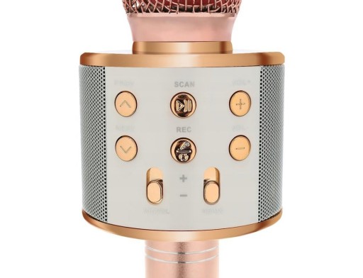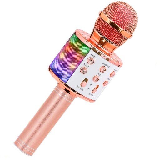 połyskliwy, metaliczny kolor jest zawsze bardzo na topie. Efektownego designu dopełnia delikatne podświetlenie głośników, które po włączeniu świecą na niebieski kolor. Do wyboru są aż 3 kolory mikrofonów – czarny, rose-gold (miedziany) oraz złoty. Jest to doskonały pomysł na prezent, niezależnie od wieku.
