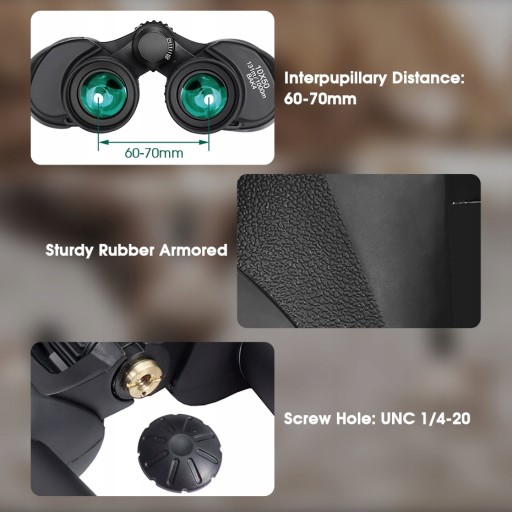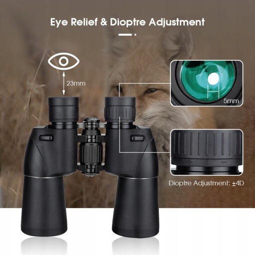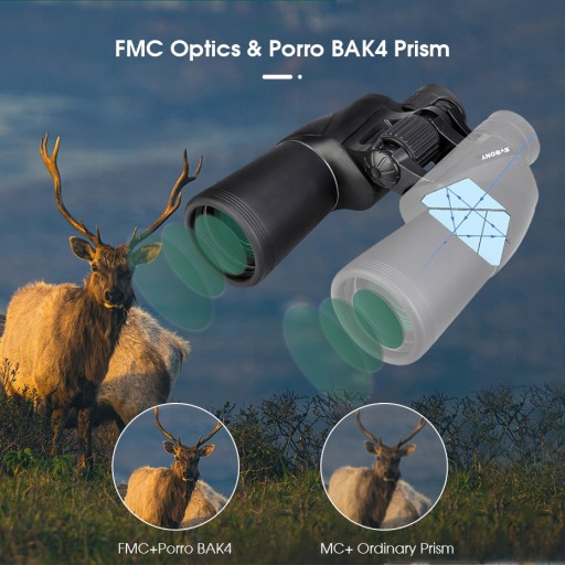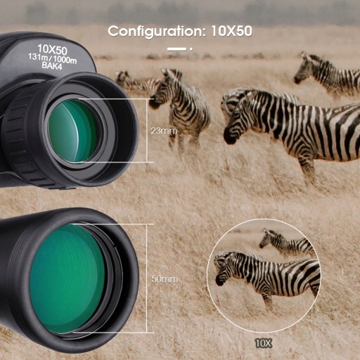 W pełni powlekany zielony obiektyw 50 mm i pryzmat Porro BAK4 zapewniają wysoką przepuszczalność dla jaśniejszej i wyraźniejszej apertury oraz zapewniają wyraźne, szczegółowe i kontrastowe obrazy oraz zapewniają łatwą obserwację nawet w warunkach słabego oświetlenia.