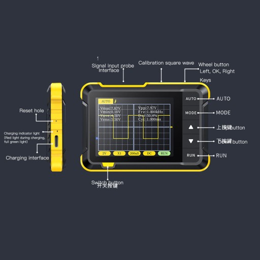 Funkcja:1. PRZENOŚNY OSCYLOSKOP: Kompaktowy rozmiar pozwala nosić go ze sobą, dzięki czemu jest mały i praktyczny. Tylko wielkości dłoni, ultracienki i lekki korpus, eliminujący problem ciężkiego i trudnego do przenoszenia sprzętu!