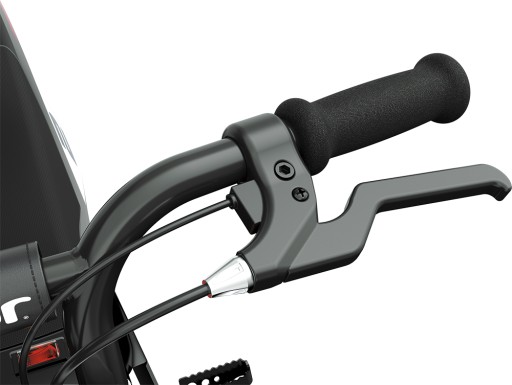 - Posiada wzmocnioną kierownicę, 12" koła szprychowe, chowaną podpórkę i ręczny hamulec tylnego koła