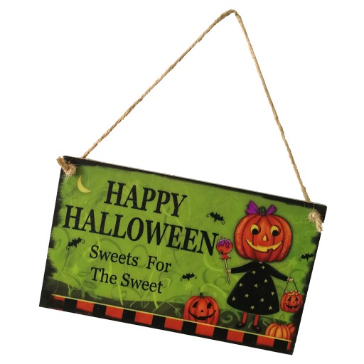 Wisząca tablica wykonana z drewna, HALLOWEEN, słodycze na słodką i uroczą ę malowaną i linę jutową łatwą do zawieszenia