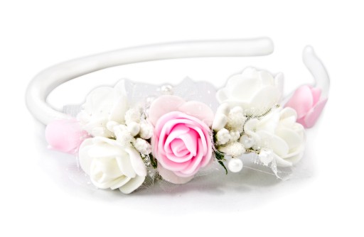 Opaska komunijna przyozdobiona kompozycją kwiatków i listków z koralikami.