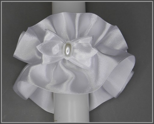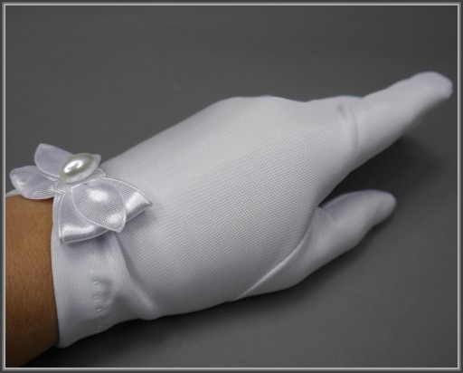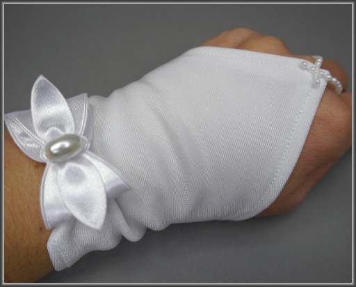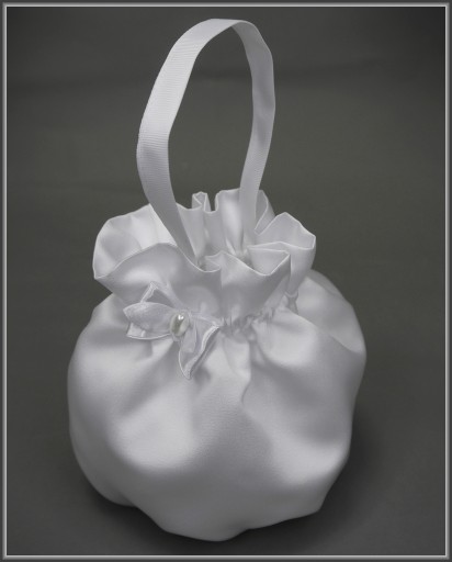 Torebka biała do komunii z trzech warstw tkaniny: satyny ślubnej pierwszego gatunku, sztywnego tiulu i tkaniny cambel. Na pozostałych aukcjach można do niej dopasować np okapnik na świecę komunijną lub rękawiczki.