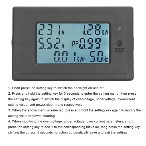 - 2. Naciśnij i przytrzymaj przycisk SET przez 3 sekundy, aby wejść do menu ustawień. W tym momencie naciśnij i przytrzymaj przycisk SET, aby przełączać się między wyświetlaniem ustawień wartości nadmiernego napięcia, wartości poniżej napięcia i wartości nadmiernego prądu, a także menu resetowania baterii.