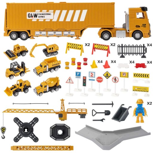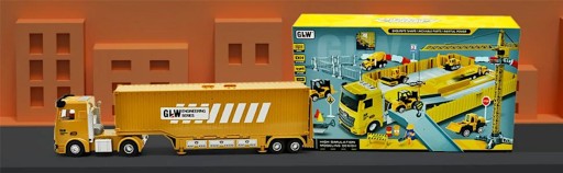 Ten fantastyczny samochód ciężarowy w mgnieniu oka zmieniasz w plac budowy, na którym pracować będzie koparka, betoniarka, spychacz, wywrotka, walec oraz wózek widłowy. Ruchomy wysoki stabilny dźwig z metalowym obciążnikiem przeniesie w odpowiednie miejsce na budowie potrzebne materiały, a także ciężkie maszyny budowlane. Bezpieczeństwo na placu budowy zapewnią znaki oraz bramki ostrzegawcze. Autentyczności zabawie dostarczą dołączone do zestawu dwie figurki budowlańców oraz ruchome elementy pojazdów budowlanych.