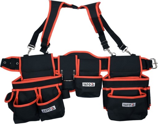 Pas narzędziowy na szelkach z dwiema zakładanymi dużymi uniwersalnymi sakwami ,metalowym uchwytem na młotek i jedną głęboką kieszenią na gwoździe lub wkręty. Długość pasa głównego zapinanego na metalową klamrę wynosi około 1280 mm .