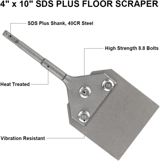 Posiada trzy śruby blokujące, tworząc stabilną strukturę antywibracyjną i ma gumę anty-sosnową do mocowania.4 w. Szerokie ostrze, 10 cali. Całkowita długość, śruby zostały zmontowane z góry. Wymienne 4 cal bardzo szeroki ostrze pozwala na bardziej pionowe skrobanie i usuwa więcej cieńsze na przejście.Chwyt SDS Plus, przeznaczony do młotów obrotowych SDS Plus i powinien być używany tylko w trybie młotkowym. Błąd pomiaru wynosi /- 1-3cm.