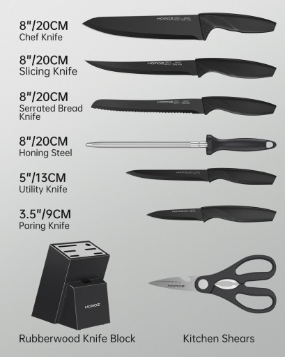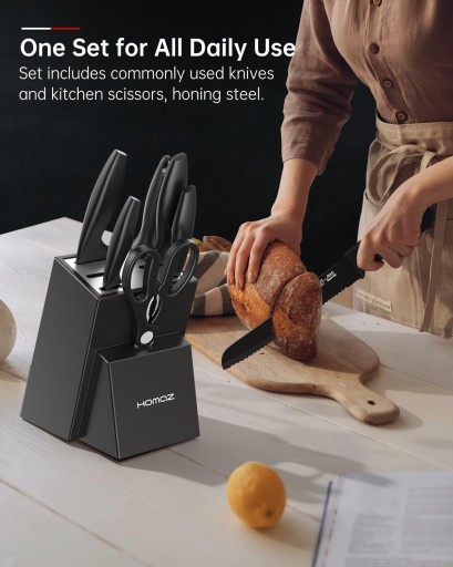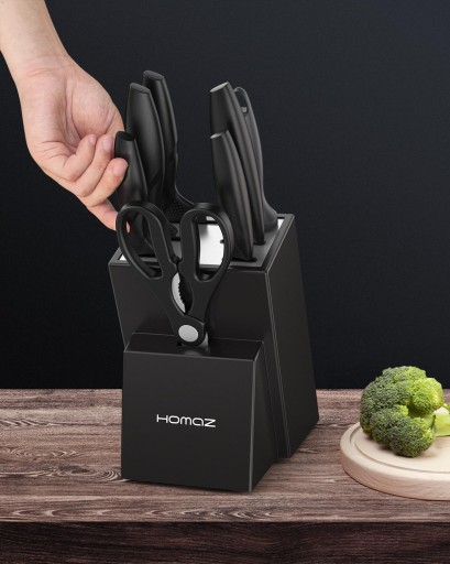 Zestaw noży z blokiem to perfekcyjne rozwiązanie dla każdego pasjonata gotowania, zarówno amatora, jak i profesjonalisty. Ten kompletny zestaw 8 noży kuchennych od Homaz life zapewnia niezbędne narzędzia do krojenia, cięcia i szatkowania różnorodnych składników.