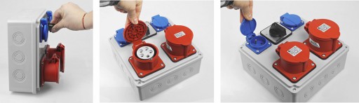 Gniazda jednofazowe 230V, posiadają klapki, dzięki czemu ich szczelność jest na poziomie IP54.