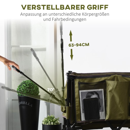Ten wózek Outsunny zdejmuje obciążenie z twoich ramion! Kiedy idziesz na kemping, idź na plażę, lub przynieś niesamowitą ilość zabawek na plac zabaw, nie potrzebujesz już dużych toreb kempingowych, aby nosić wszystko, czego potrzebujesz. Wystarczy złożyć samochód i zabrać go ze sobą do bagażnika. Nawet podczas zakupów lub ogrodnictwa samochód okazuje się niezwykle praktycznym małym pomocnikiem, który uwalnia Cię od dużej ilości pracy i obciążenia.