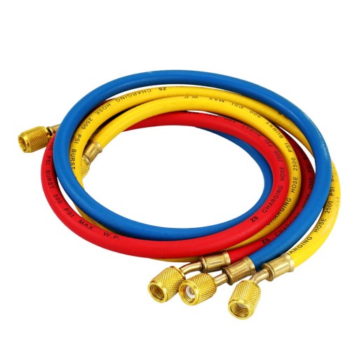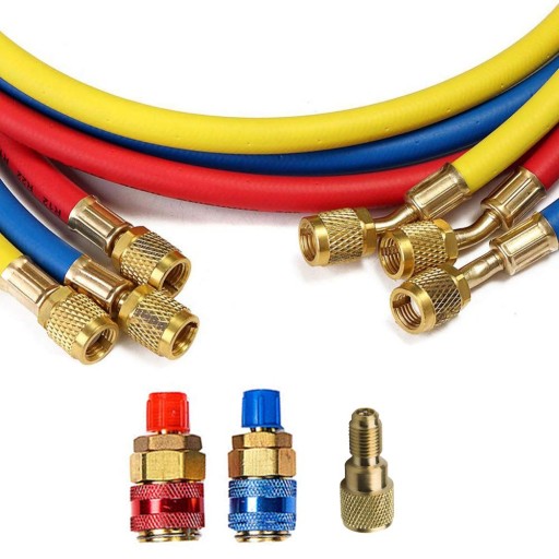 ✔️W zestawie hak i 3 węże (czerwony, niebieski i żółty). Rozdzielacze są dwukierunkowe i wykonane z mosiądzu.
