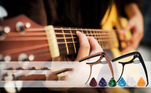 【Capo na gitarę】1 capo wykonany z wysokiej jakości metalu, z 6 kostkami do gitary w różnych kolorach, dobry capo ułatwia tworzenie muzyki, rozmiar capo 7,5*9*1,3 cm, rozmiar kostki 25*30*0,71 mm .