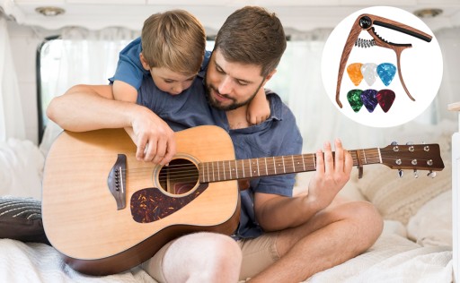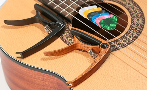 Capo w kolorze drewna, rozmiar capo 7,5*9*1,3cm, 6 kostek do gitary w różnych kolorach, rozmiar kostek 25*30*0,71mm.
