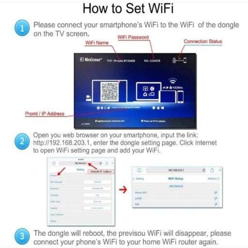 2. Połącz swój telefon z MiraScreen przez Wi-Fi. Uruchomione (192.168.203.1) na swoim telefonie, aby udostępnić Internet dla MiraScreen (podłącz MiraScreen do domowego routera WiFi).