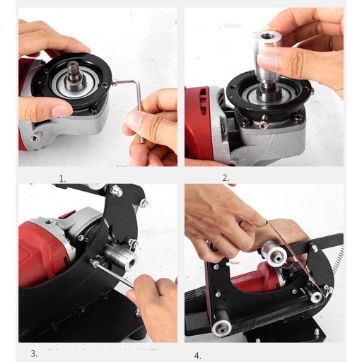 [Łatwy w instalacji]: Adapter taśmy szlifierskiej jest łatwy w montażu i demontażu. Dzięki pokrętłu regulacji naciągu taśmy szlifierskiej można ją łatwo regulować i ma długą żywotność.