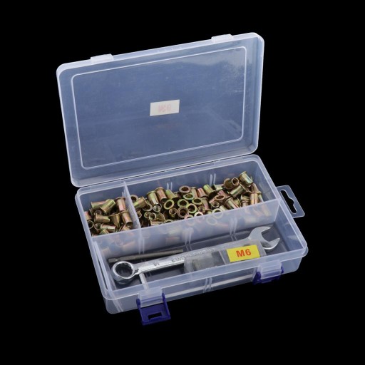Skrzynka narzędziowa zawiera klucz sześciokątny 14 cm, sześciokątną głowicę wsadową, klucz sześciokątny, 5 sztuk cięgien M6 i 100 sztuk nakrętek M6.