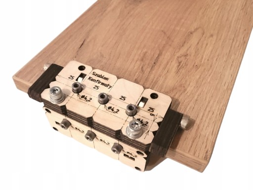 Szablon uniwersalny przystosowany do wykonywania połączeń konfirmatowych o średnicy rdzenia konfirmatu 4,2 mm.